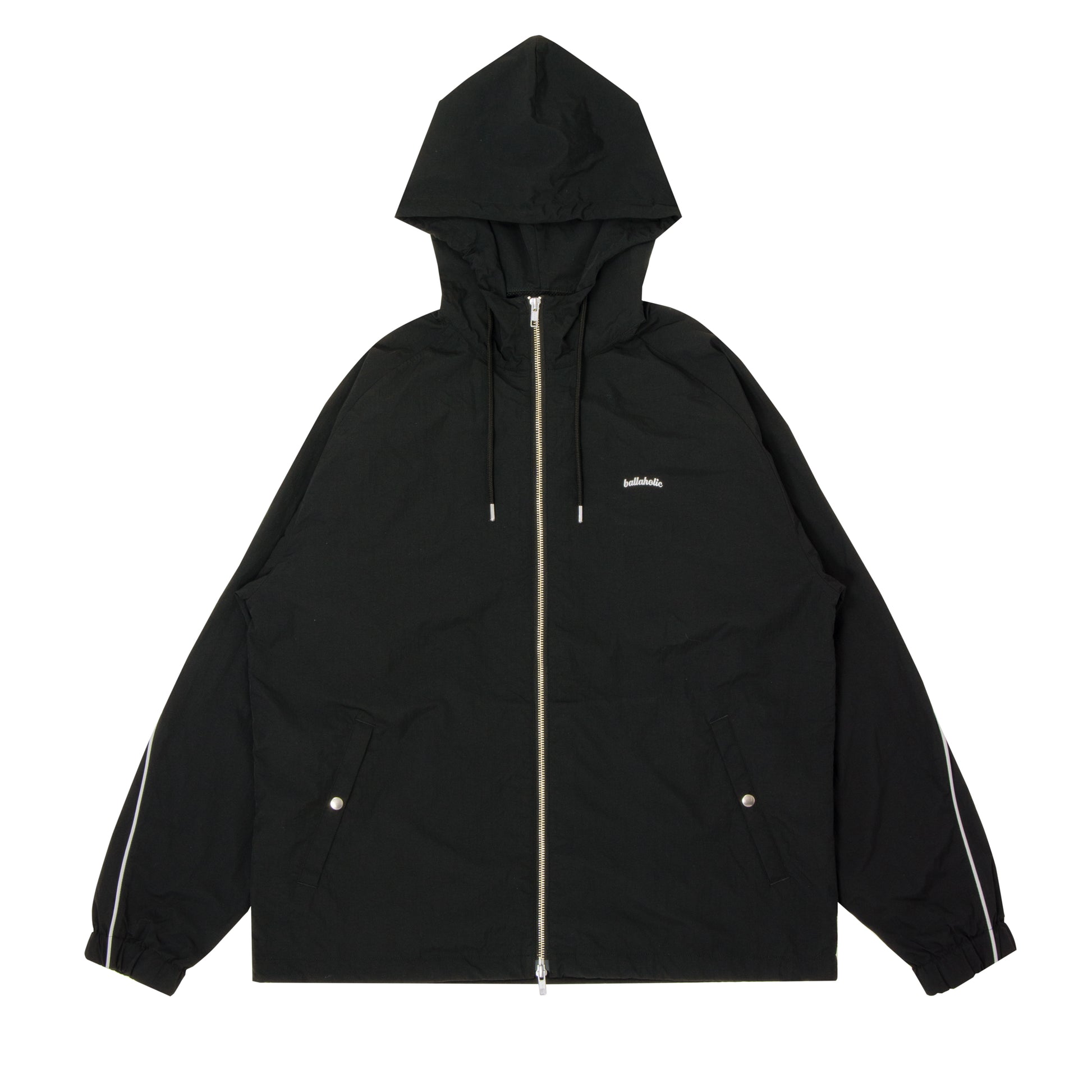Front: Reflective ballaholic logo print on left chest, double zip closure, two-button pockets